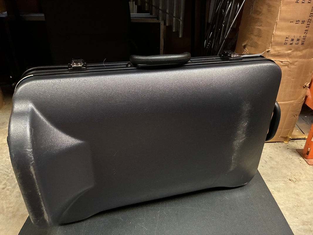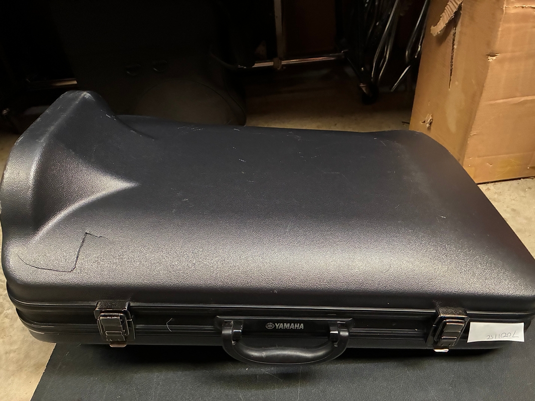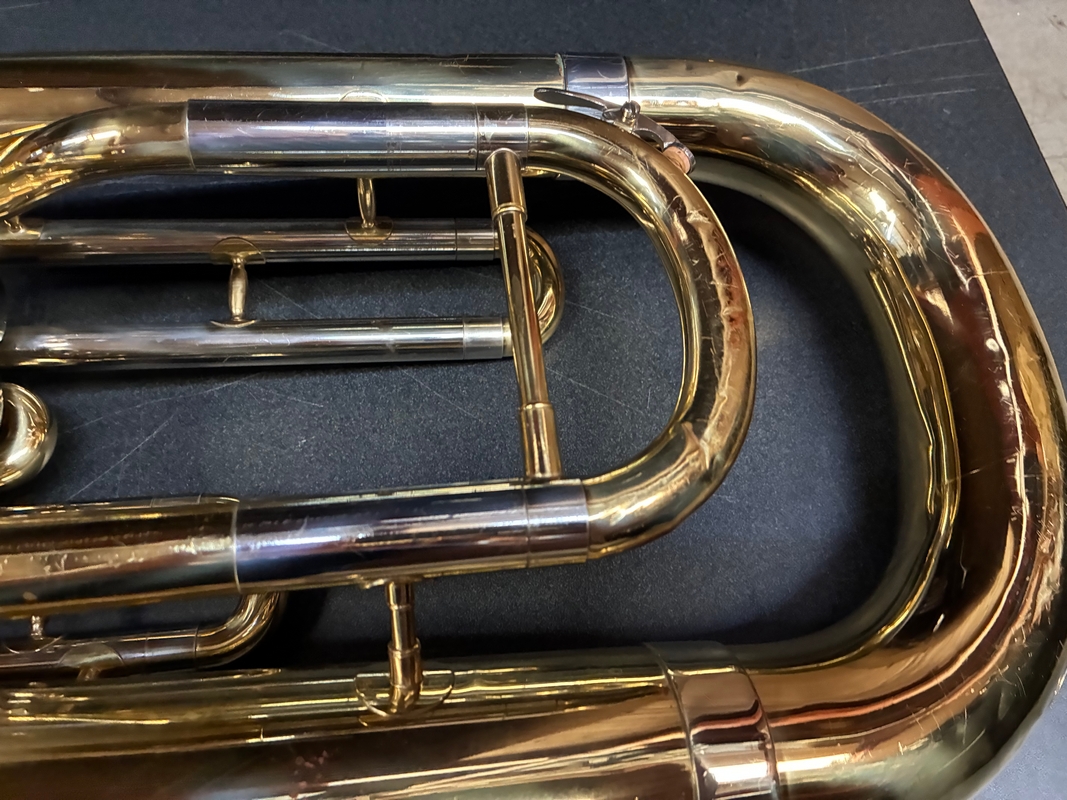 Instrument had damage around the bell when it came into the shop. The bell has been repaired, and only cosmetic wear remains. The instrument has been fully cleaned and is in good playing condition. The case has a crack on the side, as well as various scuff marks.